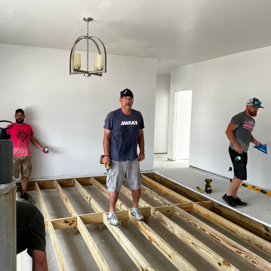 The Saunders house had a sunken living room so we wanted to elevate that for Ms. Nicole so she wouldn’t fall due to her MS. So the boys got started on that while us girls got to painting! We painted the ceilings and walls of 7 different rooms – every room but one bathroom. We all took turns writing scriptures, blessings, and prayers on the doorway studs in the house also.