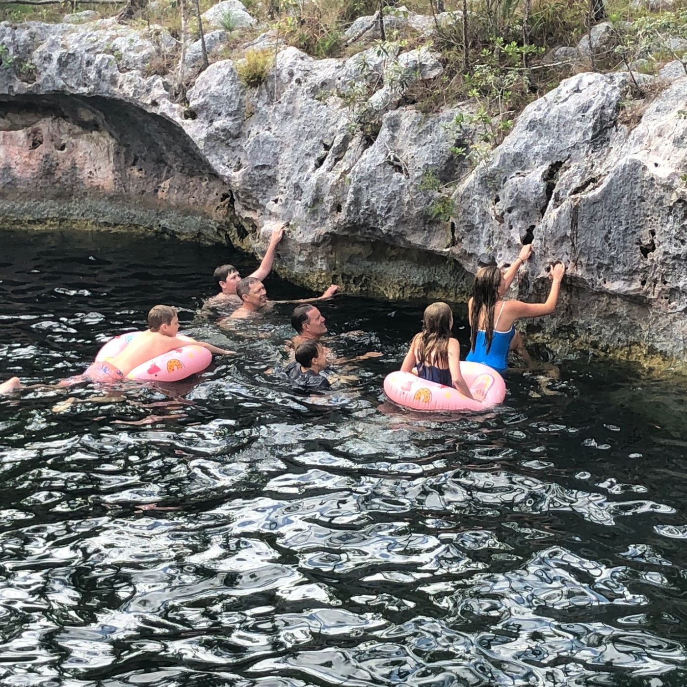 Crystal clear, cool water was a great way to relax this morning. We felt protected by all the pine trees around us, and many of us wondered who actually discovered this wonderful geological feature stuck in the middle of a forest! After many jumps and dives (and a flip by Aubrey and Clay!) off the edge of the blue hole we packed up and headed back out the bush lined drive. Darin really enjoyed the close encounters with pine trees along the drive back out and we came to see how the side mirror was designed to fold in upon impact with a small tree with no damage!