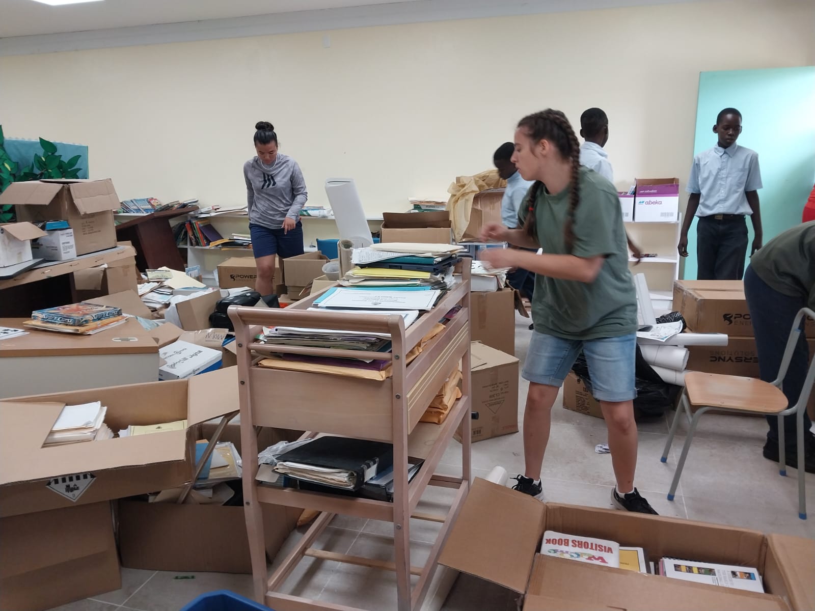 Day two. Lots of physical labor, lots of great connections and conversations. We all seemed to wake up energetic and ready to work. We split up, most of the team went to help prime and paint a preschool. Three of us -Seth, Psalm and myself- left with Lisa (Lead – Education & Early Childhood Development) and went to CAPS, the major primary school on the island. We helped organize the school library, which Lisa will be using as her classroom next school year. As we went through and boxed up old student files, books and worksheets, we had the privilege of seeing and interacting with the precious and lively students as they navigated their school’s outdoor halls.