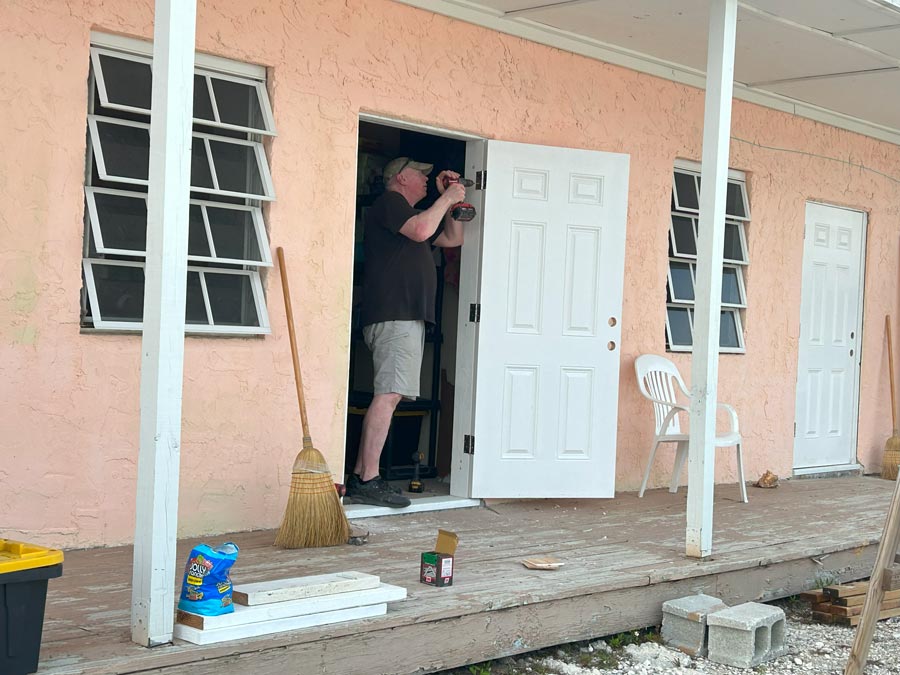 As we drove into camp at the end of our adventure, seeing beautiful Abaco, we were amazed to see not just a couple of doors hung, but Jim and Dann had hung the rest of the 9 doors! Before we left in the morning, we had asked if there was anything we could do to help prepare and make the job go smoothly. Dann’s quick answer was to pray! We did; we prayed for God’s favor and help for them. Wow, God! At dinner Dann had shared that they were exhausted and not sure they had the strength for the cleanup. But again, God had our team jump in, and as Dave has repeatedly reminded us, Many Hands make light work!
