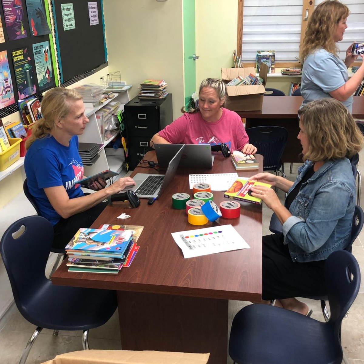 The day started with a division of labor. Half of the men went into town to clean up the pallets from the distribution center, and the other half stayed behind at camp and mowed and cleaned up the camp. The ladies were taken to CAPS (Central Abaco Primary School) to engage with students in Mrs. Mill’s classroom. I (Merridee) got to see a former student that I had tutored. It had been my prayer that I might see him. The ladies helped input books into the library and worked with small groups.
