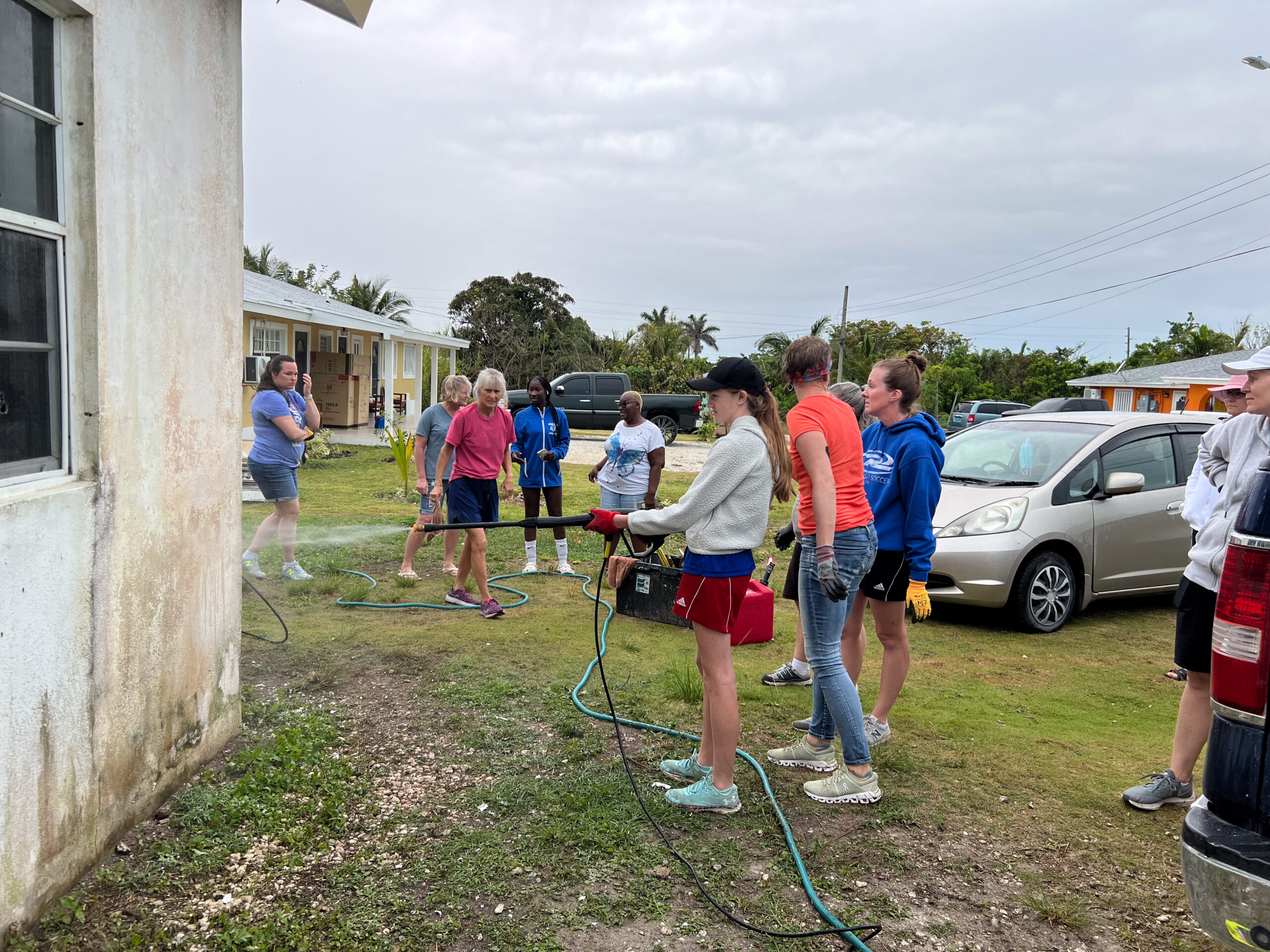 Today we worked on multiple projects. The girls worked at a house that was destroyed by the storm over four years ago that has still not been finished, while the guys went to the community center and did some flooring work on the second story. While working on the house, the girls got to work alongside some local missionaries as well as some volunteers from North Carolina. After Hurricane Dorian, the house that Larry and Nicole own was completely gone except for the exterior walls. At the beginning of this year the project was started, and we now are working on painting the outside, while the North Carolina team was working on drywalling the interior.