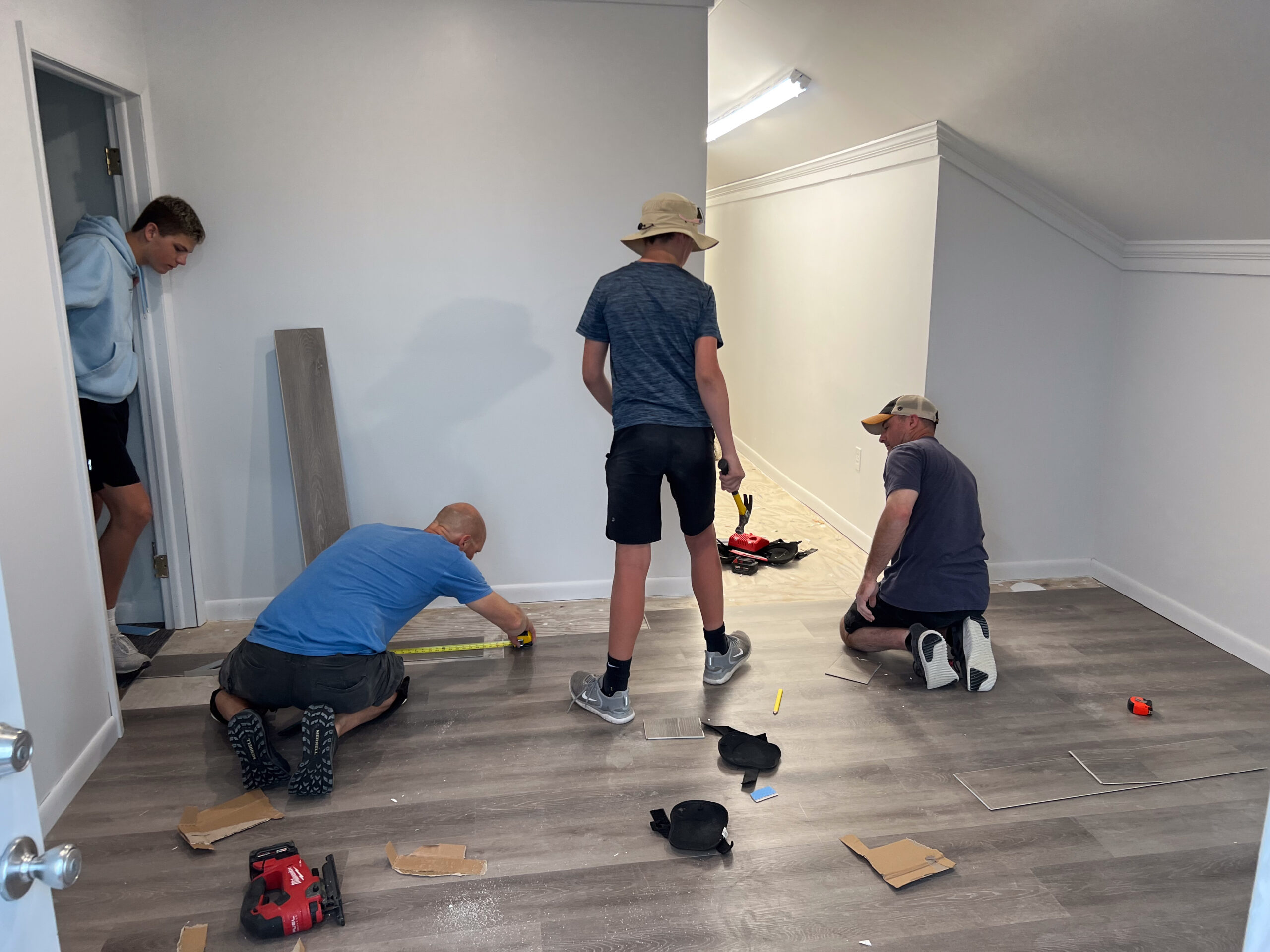 At the community center, the guys worked on installing some carpet along with installing luxury vinyl flooring on the second floor. We picked up some trash around the community center as well.