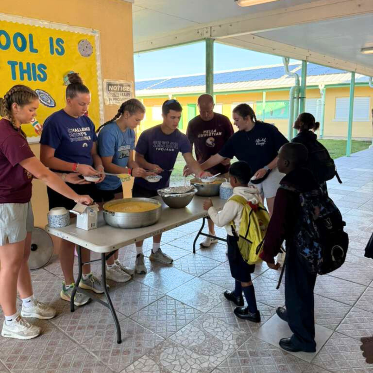 Some of the team helped serve breakfast (grits and tuna) and some were able to build even deeper relationships with kids and they showed us their classrooms. There may have even been a few piggyback rides!