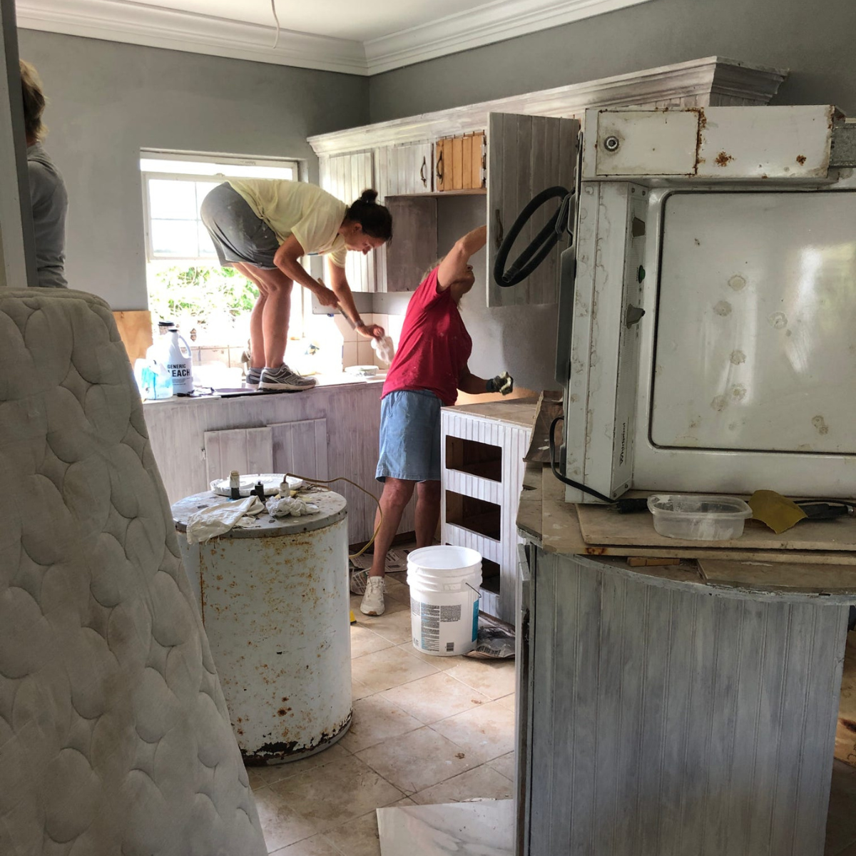 The third group went to Yvonne’s home. The project’s there included sanding and priming kitchen cabinets and sanding and staining a headboard.
