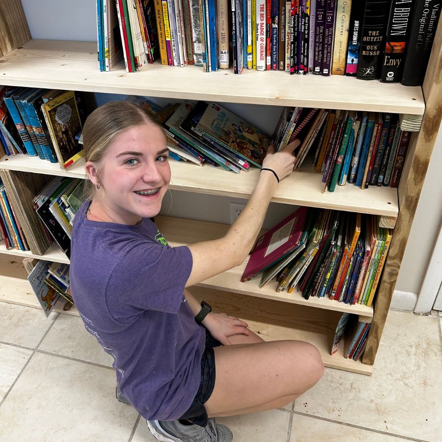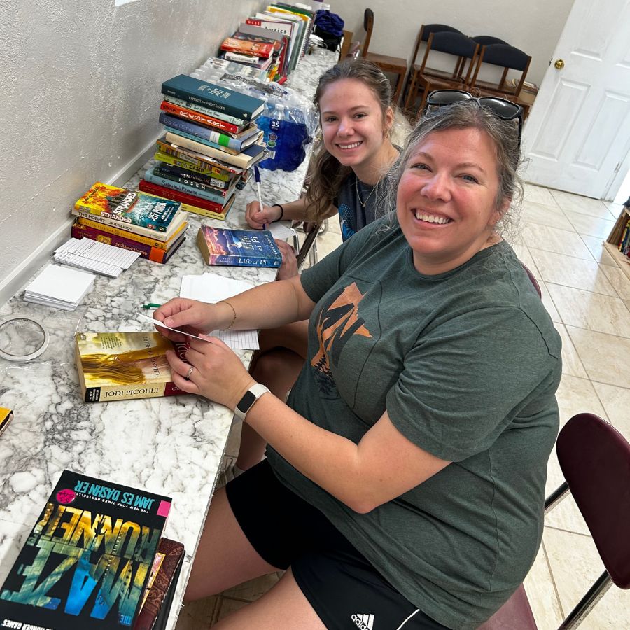 Part of the group sorting books at the Community Center